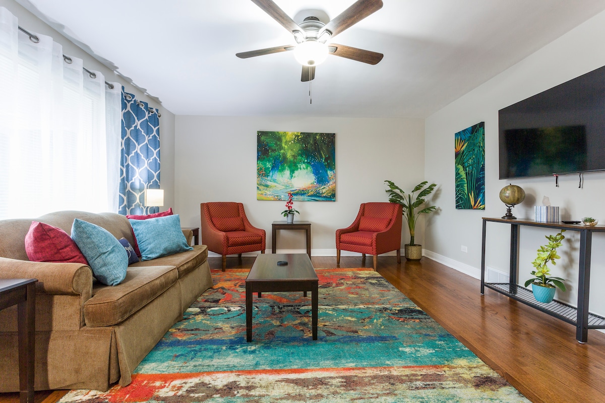 Ailənizə və ya dostlarınıza baş çəkmək, şəhərdə konfransda və ya qısa tətildə iştirak etmək üçün burada olmağınızdan asılı olmayaraq, ailəniz bütün mənzilimizi icarəyə verməyi sevəcək. Oak Parkında tarixi Frank Lloyd Wright Rayonunda gözəl bir məhəllədə yerləşən evin bütün komfortları var. Burada, Frank Lloyd Wright Home/Studio, Oak Parkın mərkəzi, inanılmaz restoran və görməli yerlər, sizi Çikaqonun mərkəzinə aparacaq Yaşıl və Mavi xətt qatarlarına, eləcə də əsas avtomobil yolları və ticarət mərkəzlərinə yaxın olacaqsınız.