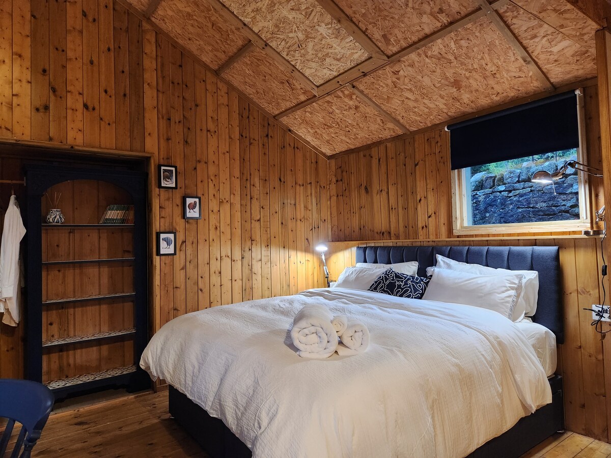 A cosy, rustic hut in a field with 2 comfy kingsize beds (sheets & duvet not provided), en suite shower & loo, set in a secluded spot on a small, quiet 36 acre farm with fishing lake & boat in a remote, beautiful, little visited, yet very accessible area of the Pennines with expansive views of the stunning Thursden Valley. An extensive network of footpaths lead to Extwistle Moor, the cairn circle & tumuli above Ell Clough, the Bronte Way, Pennine Way & Bridleway. Sorry no dogs. No loud music.