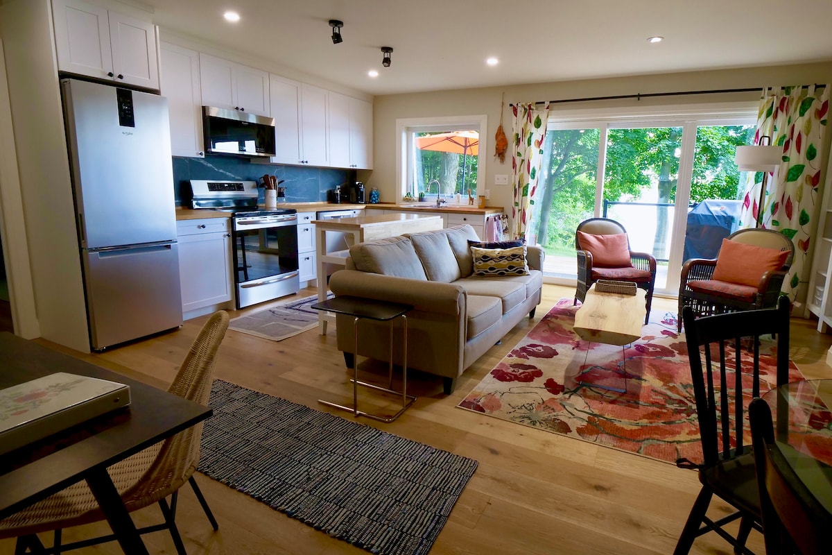 Woodsy Loft, an ideal home base for not just the beach and stunning sunsets, but Blue Mtn, Scandinave Spa, C-wood, brand new casino, all close by. Many bars, restaurants, beach and other things to do, within 5 min. Great place to stay in, too. Packed with amenities like screened in patio, XL bathtub w/ towel warmer, King size bed, 'The Frame' TV, full kitchen, fast WIFI, motorized blind...and the list goes on. Situated and designed to offer max. privacy and relaxation.