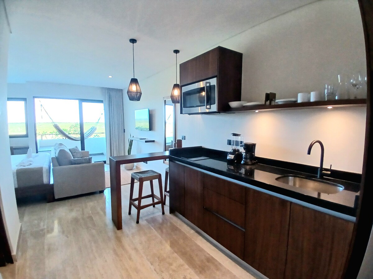Mahahualda cütlüklər və uzaqdan işləyənlər üçün hazırlanmış cəngəllik spa studiyasına qaçın. Sulu cəngəllik mənzərələri, okean mənzərəli damüstü sonsuzluq hovuzu və okean sahilinə birbaşa çıxış imkanı ilə özəl cakuzi hovuzundan zövq alın. Studiada sürətli Wi-Fi, xüsusi iş sahəsi, liftlər və sakit, müasir tropik dizayn var. Dincəlmək, işləmək və təbiətlə yenidən əlaqə qurmaq üçün sakit bir məkan.