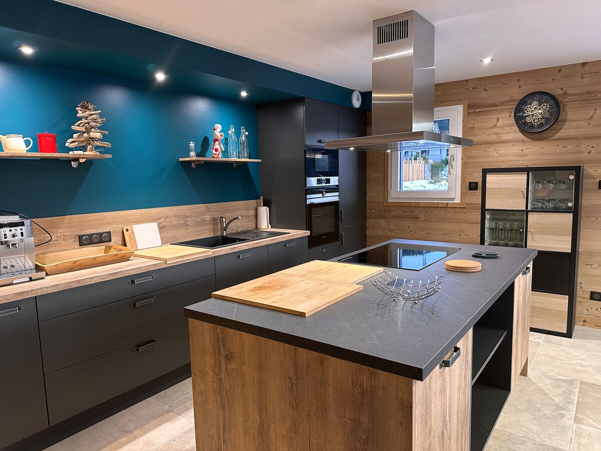 [L’esprit du Bô ] Un chalet grand confort de 300 m2 pouvant accueillir 10 pers, mariant un cadre authentique et contemporain. La cuisine aménagée et son îlot central ouvrent sur la grande table de la salle à manger. Le salon à la décoration soignée se niche entre la cheminée et la terrasse principale. Quatre grandes chambres à l’esprit romantique & cosy, 2 salles de bain, 2 WC indépendants. Un espace détente privatisé Spa, Sauna & piscine extérieure. Deux terrasses. Garage Vélos,motos..