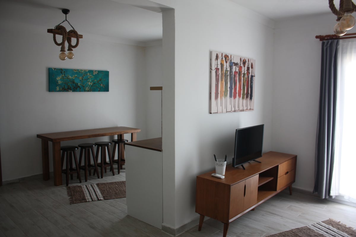 Bağda incəsənət əsərləri ilə təchiz olunmuş geniş, xoş və rahat 1+1 studiyası var. Ticarət mərkəzlərinə və ictimai nəqliyyata 5 dəq. piyada, ictimai çimərliklərə 10-15 dəq. piyada, marina, park və s. Gümüşlük 6 km, Bodrum isə 19 km-dir. Mebel, adətən, ağacdan və sənət əsərlərindən ibarət olur. Tətilə çıxarkən rəsm və ya incəsənət işləri ilə məşğul olmaq istəyirsinizsə, lazımi materialları rəsm emalatxanasında tapa bilərsiniz. Gözəl bir təcrübə yaşayacaqsınız.