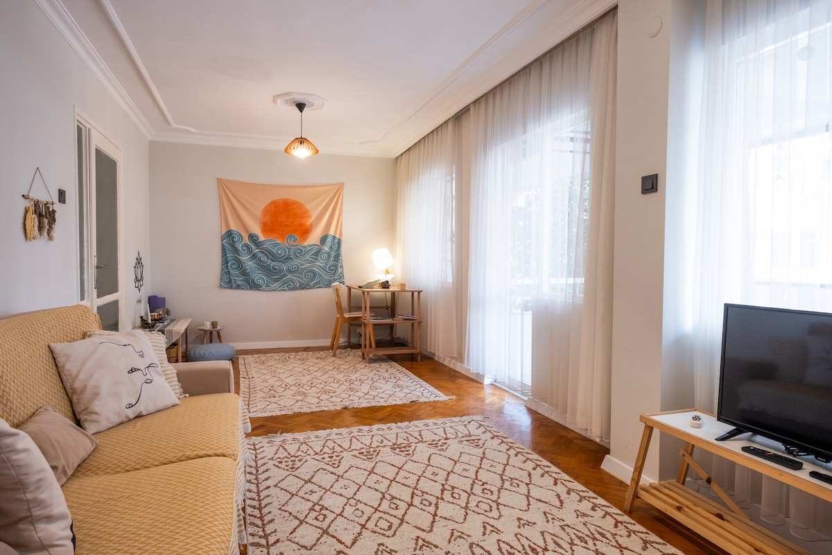 Located in a central location, you can easily access everything as a whole group. Note1: The apartment is located on the 5th floor and there is no elevator. Note2: There is air conditioning in the large bedroom and living room. There is a fan in the small bedroom for the summer period. Passport informations will be required before check-in for each guest.