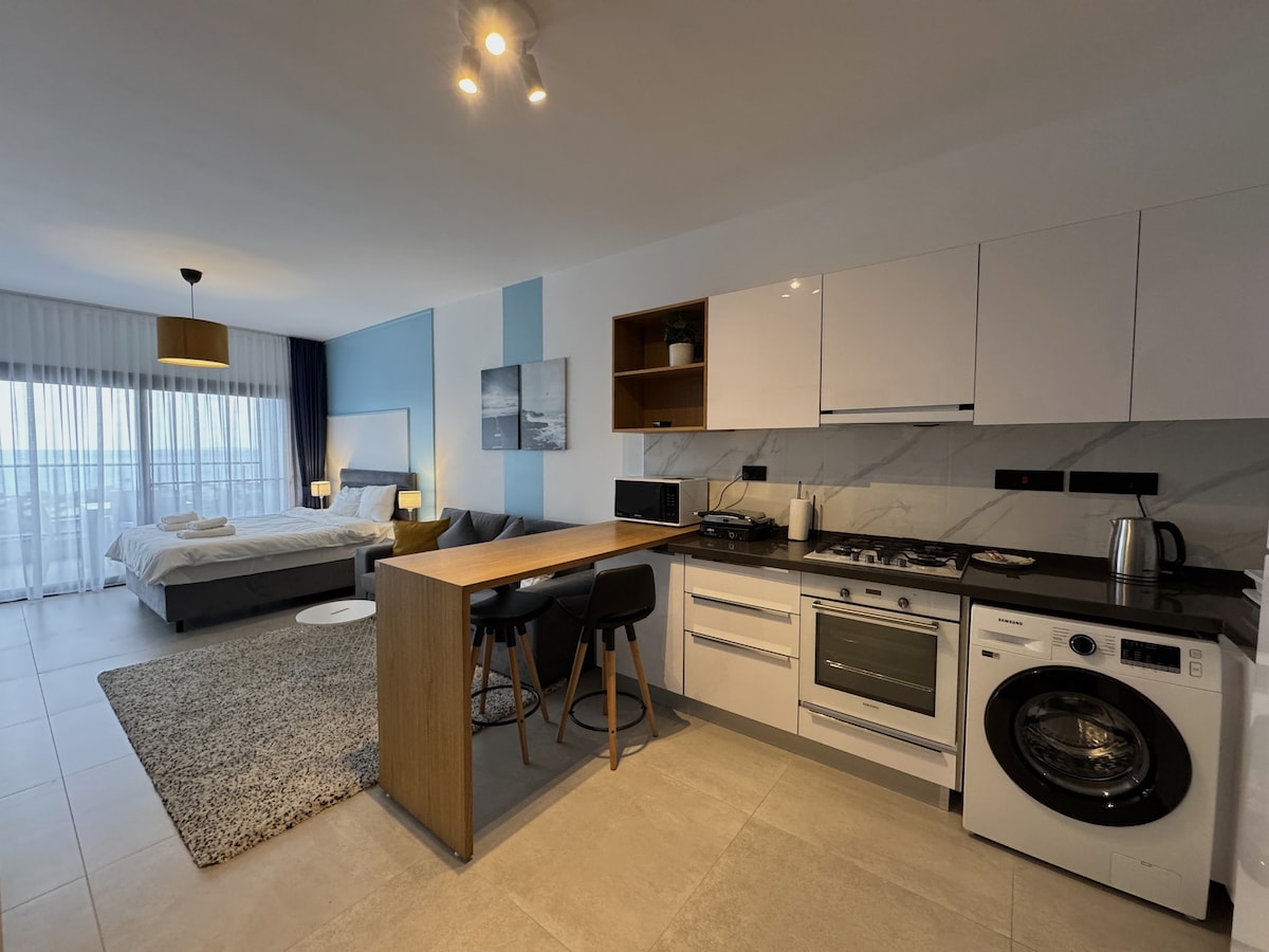 🌊 Boho-style apartment just 200 m from the sea & restaurants. Equipped kitchen, Netflix, A/C, and balcony. Free access to pool, sauna, hammam, gym, tennis court, playground & more. Supermarket is only 100 m away, open daily from 7:30 AM–10:30 PM. Perfect location for both relaxation & adventure—with nearby casinos and wild donkeys by the sea that walk beside your car. A truly unique stay awaits!