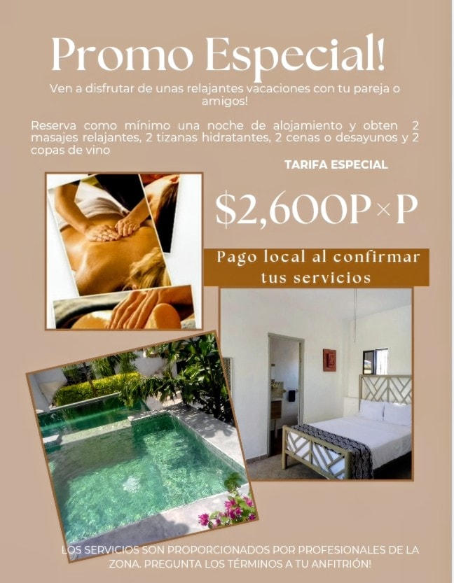 Qonaqlar hovuz sahəsi də daxil olmaqla özləri üçün ayrıca otaqlarından zövq alacaqlar. Orada "qonaqlama" tapa bilərsiniz. Bu, onların gününü keçirə biləcəkləri bir otaqdır. Qonaqlamanın yanında qonaqların zövq ala biləcəyi hovuz və bağça var. Biz ev sahibi olaraq sizə ev sahibi kimi kömək etməyə hazırıq. • Əmlak üzrə əlavə xidmətlər: 29 - Yoqa Dərsləri - Meditasiya dərsləri - Xüsusi səhər yeməyi planı və qəlyanaltılar (əvvəlcədən cədvəl) - Tiendita (Oxxo)