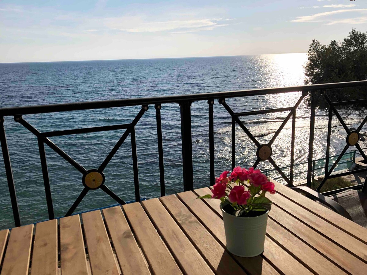 You wake up, the sun is rising behind mount Athos. You enjoy a cup of coffee, while the dolphins jump on the horizon. You walk to the beach and the only thing you can hear is the sea. You cook outside, watching the boats passing by and the seagulls chasing the fish. Now, it's time for drawings and board games. Finally, you have a glass of wine, waiting for the moon to rise behind the hills.