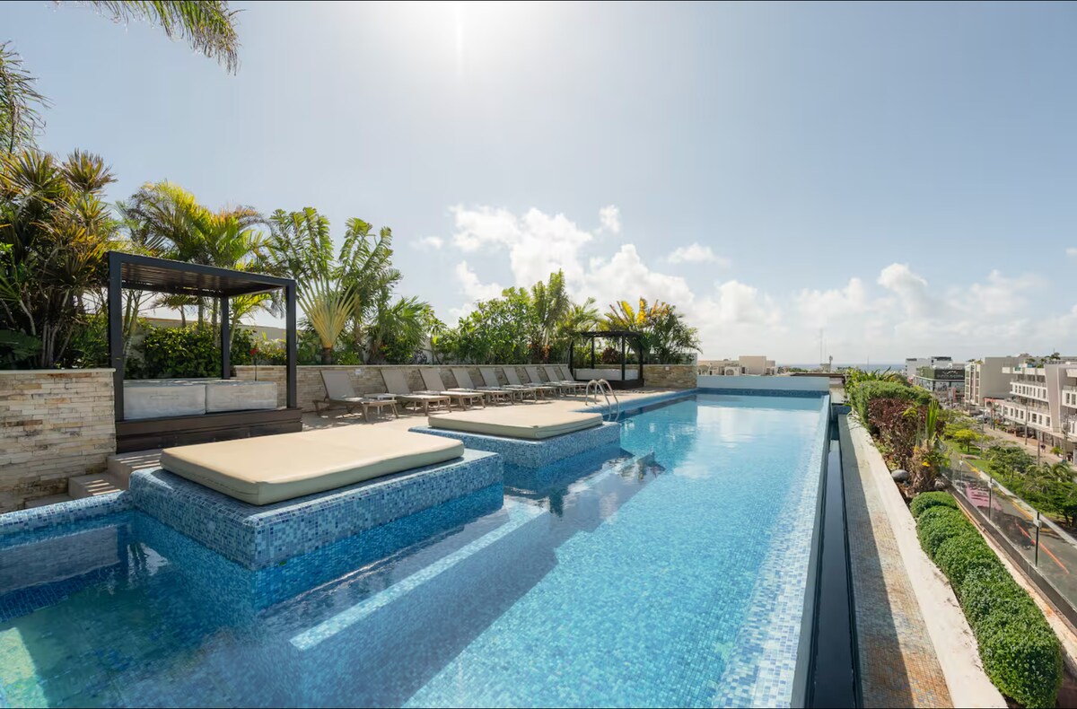 Bu kondominium çimərlikdədir, hovuz/istilikli vannası və barmeni olan möhtəşəm dam terrası var!! Qoruyucu zonada olduğumuz üçün çimərliyə birbaşa giriş yoxdur, lakin çimərlik binanın/blokun ətrafında cəmi 2 dəqiqəlik məsafədədir. Playa Del Karmendə ən yaxşı mənzərələr! Çimərliyə yaxın əsas mövqe və 5-ci prospektdən bir neçə blok. Damüstü hovuz və cakuzi, lobbi və iş sahəsində Wi-Fi və okean mənzərəli tam idman zalı daxil olmaqla bütün imkanlara tam giriş. Binanın altında pulsuz, qapalı və təhlükəsiz parkinq.