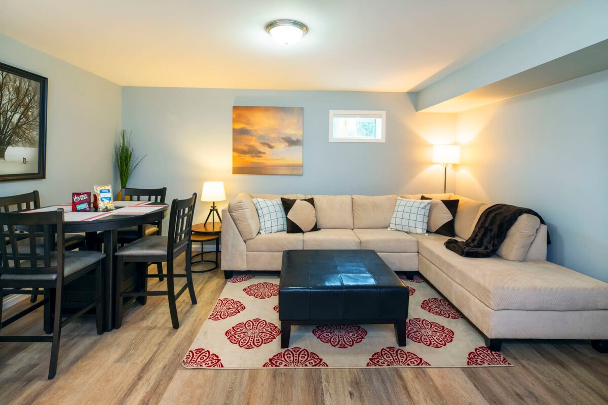 Şəhərin mərkəzində yerləşən bu lüks 1 otaqlı mənzil konfrans mərkəzlərinə, qəhvə dükanlarına, alış-veriş və baqqal mağazalarına yerimə məsafəsindədir. Yataq otağında iki nəfər kraliça ölçülü yaddaş köpüklü döşəkdə yerləşir. Yerli kabel (50+ kanal) və Netflix ilə 55" düz ekranlı Smart TV ilə geri qayıdın və dincəlin. Tam mətbəx və qab-qacaqla öz yeməklərinizi hazırlayın. Qonaqlamanıza daxil olan pulsuz geniş parkinq var. Sorğuya əsasən əlavə çarpayı (hava döşəyi) mövcuddur.