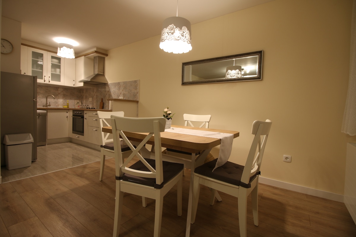 1 yataq otağı, iki açılan çarpayısı olan qonaq otağı/yataq otağı, yemək otağı olan mətbəx, hamam otağı. Kvaternkov Trg-də. Mərkəzdən 15 dəq. (1,5 km). Əsas avtovağzal 1,5 km, qatar stansiyası 2 km məsafədə yerləşir. Avtobus və hava limanından küncdə.