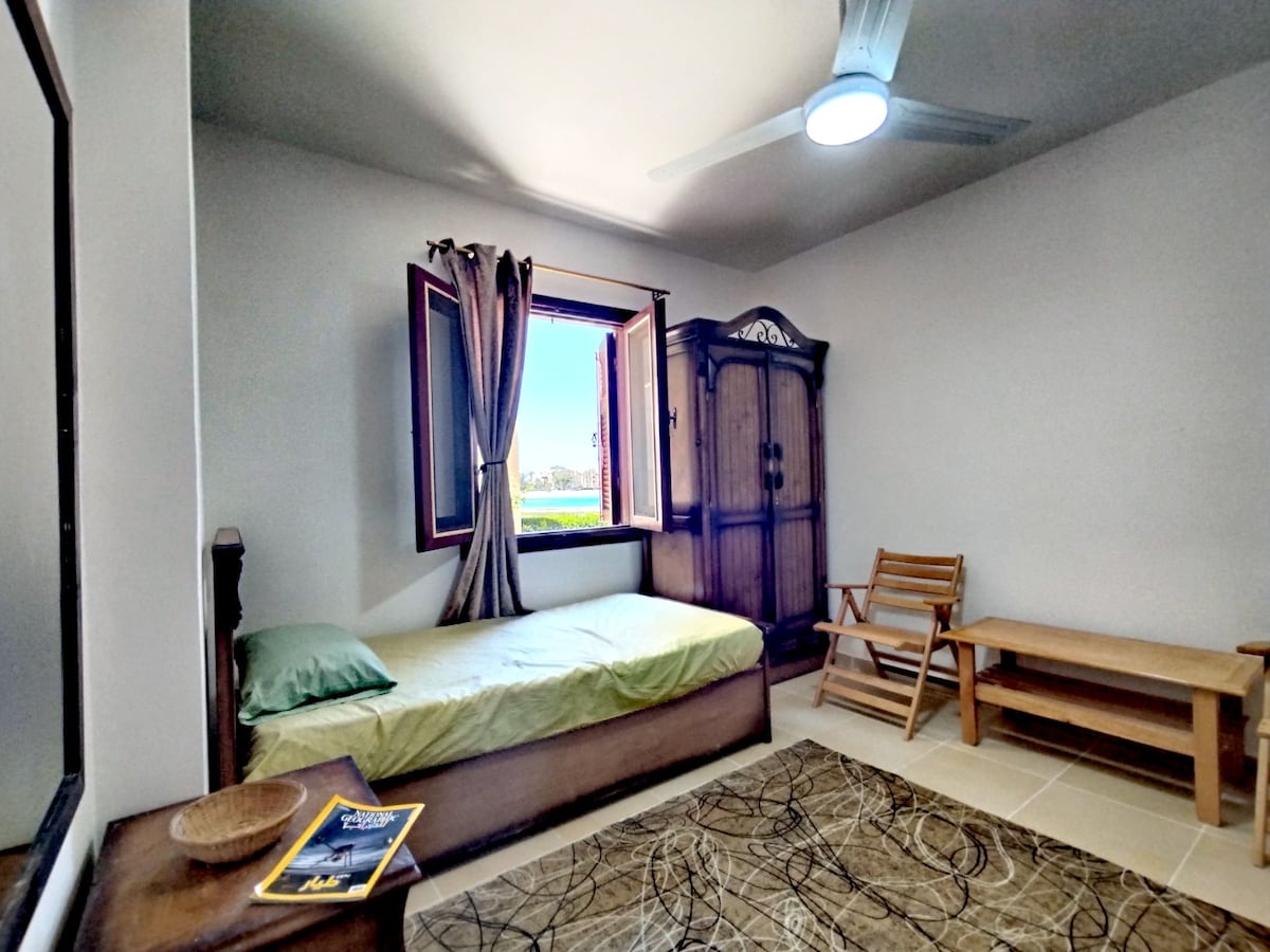 My home is a cozy, two-bedroom ,four beds . It’s just a two-minute walk from the marina, and it overlooks the serene lagoon. The rooms are spacious, bright, and perfect for a relaxing getaway. Guest access A payment of 2000 EGP per person this required to receive the QR codes and beach access
