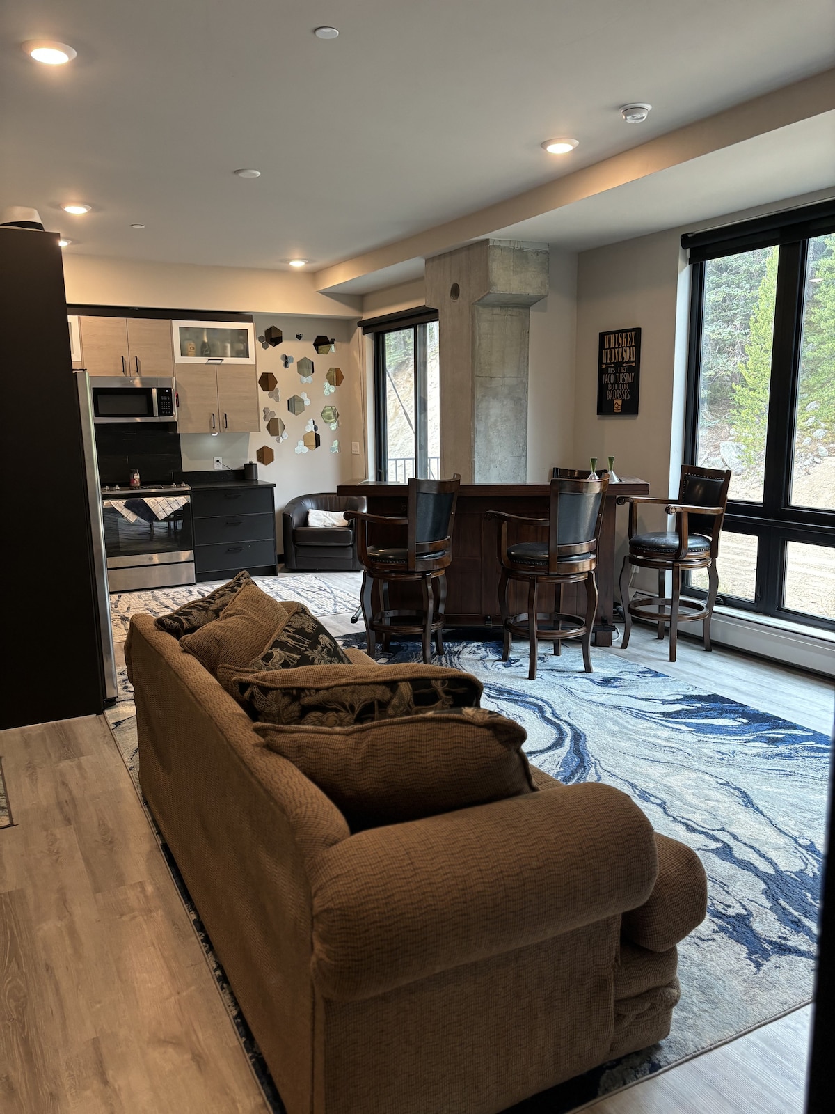 Awesome Front Corner Condo w/mountain views/private deck in modern building. Two heated outdoor hot tubs, firepits, grilling areas, 3 king beds (hi end sleeper). 3 smart TVs (recording dvr), in-unit washer/dryer, 2-3 min walk to gondola. New appliances, fully stocked kitchen, computer desk w/chair in 2nd br, walk-in pantry, full-sized fridge, induction stove/oven, blackout blinds. Paid Parking (Winter Park Short-Term Rental Registration No. 005388)