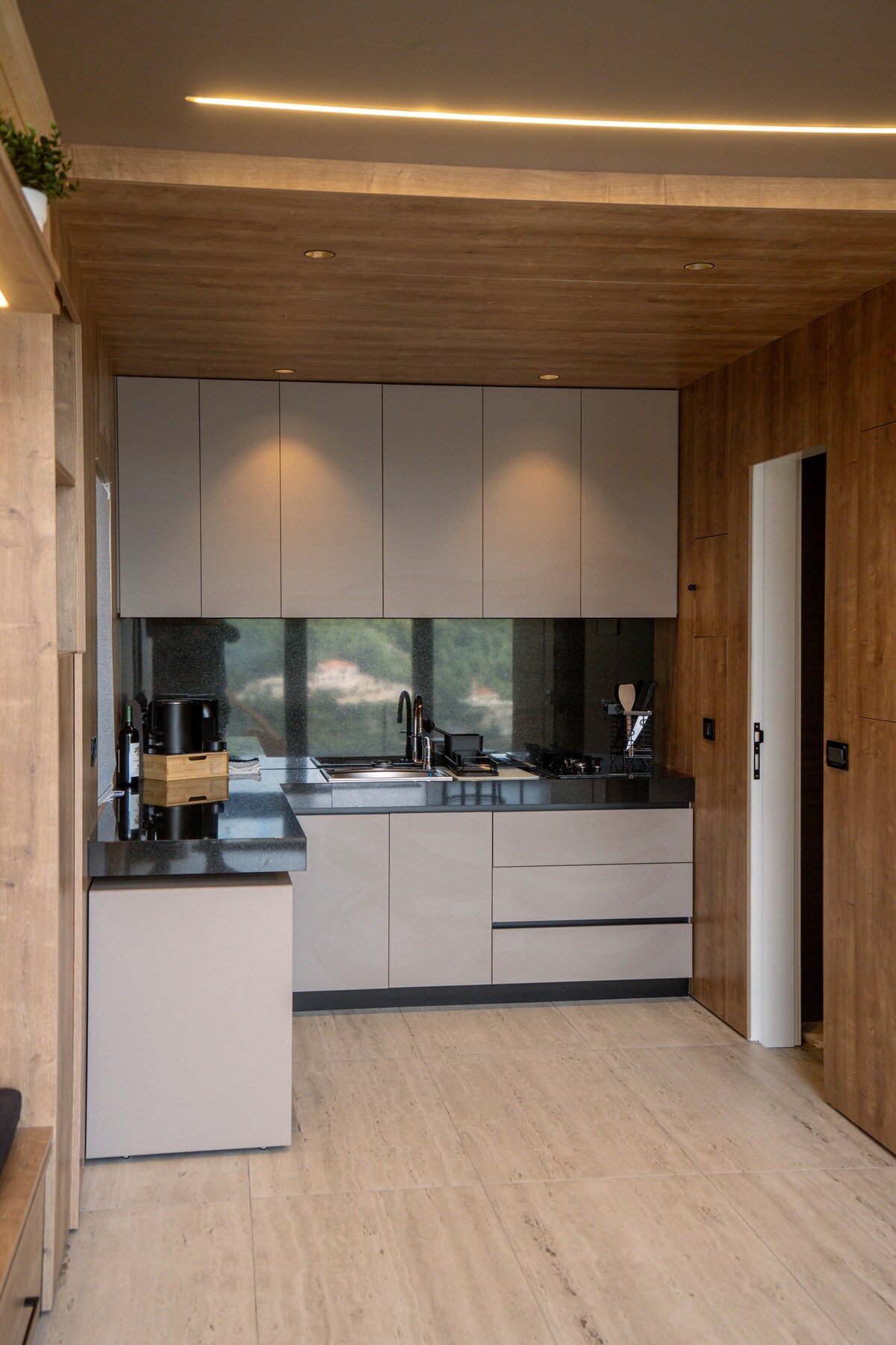 Otaqda su kimi işıq var, onun bej divarları günü udur. Yanğın azalır, daha çoxu alovdan daha çox nəfəs alın. Yaşıl məxmər stullar sakit fikirdə yerləşir, künclərə sıxışdırılıb yavaşlayırsınız. Heç nə diqqət tələb etmir. Hər şey bunu təklif edir. Hamam otağı olduğu kimi açılır səssizlik: təmiz, danışılmamış. Tam 360° mənzərəli, dağ mənzərəli məkanı əhatə edir terrasdan və balkondan dənizə aydın mənzərə. Burada hələ də davam etmək mümkün deyil. Dizayndır. Məkan hiss etmək, yerinə yetirməmək demək idi.