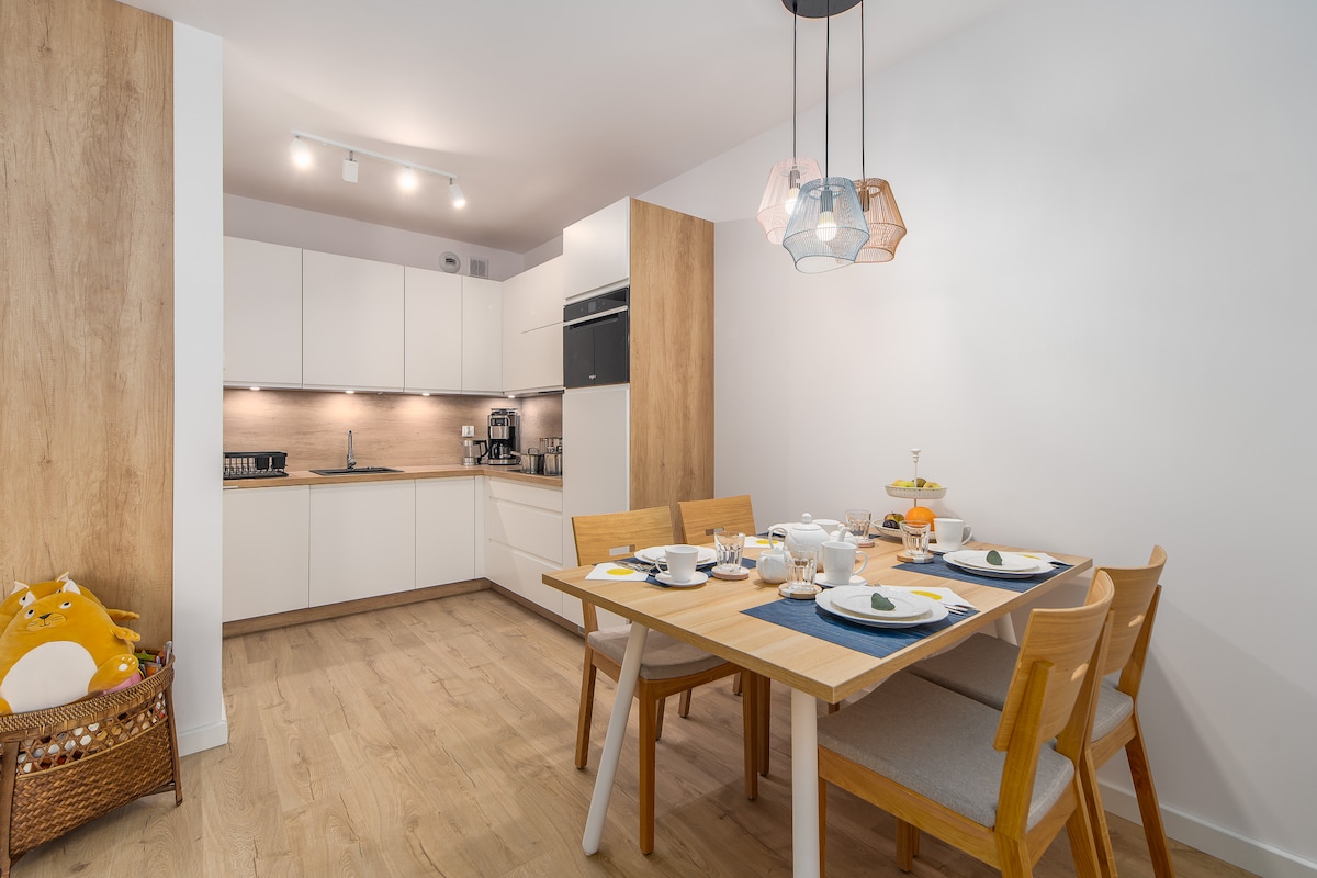 A modern, spacious and comfortable apartment in the 'Platany' complex located on the Solna Island in the very center of Kolobrzeg. The apartment with a balcony and a beautiful view of the Drzewny Canal is located on the 5th floor of a building equipped with an elevator. Suited for up to 4 people, it is the perfect choice for a holidays with friends or family as well as remote working. For parents traveling with small children a cot and a high chair is also available (on request).