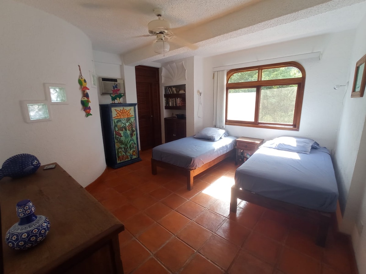 GREEN SUITE # 4 ~ ROBALO CONDO Balkon və ya terras, mətbəx və ayrıca hamam otağı olan 5 otaqlı kondominiumda. Paylaşılan ərazidə hovuz, terras və bağ. Eyni əmlakda ayrıca parkinq. 3 kilometr məsafədə 15 dəqiqədən az hava limanı və Playa La Ropa (dünyanın ən yaxşıları arasında). Zihuatanejo mərkəzi hər 8 və ya 9 dəqiqədən bir öndən keçən kollektiv nəqliyyatla 10 dəqiqə .. 🚌