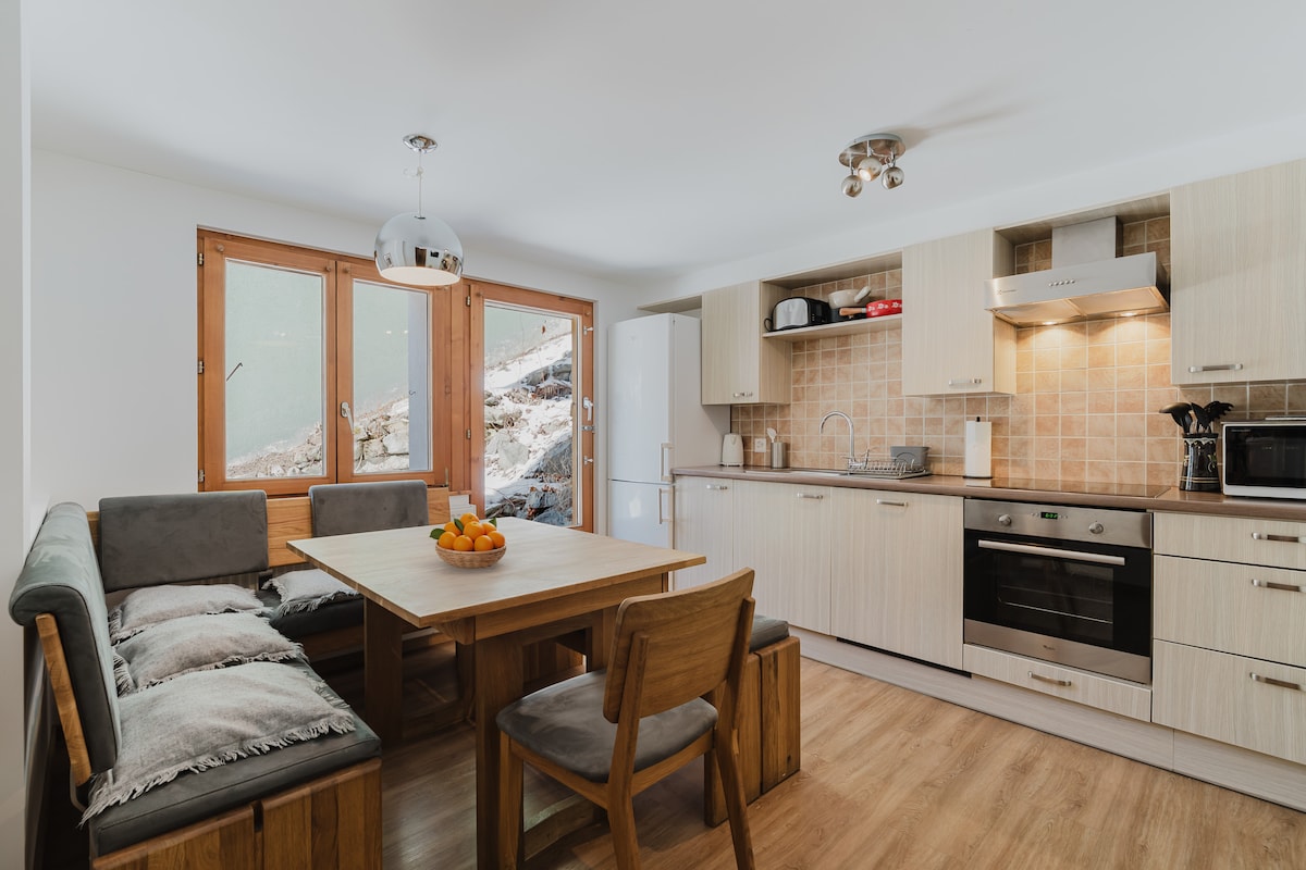 Müasir, işıqlı, səmimi və rahat mənzil, bütün imkanlara və sizi cəmi 5 dəqiqəyə xizək yamaclarına aparan funikulyora yaxındır. Yataq otağından (hətta yataqdan), qonaq otağından, iş sahəsindən və əlbəttə ki, hər iki otaqdan çıxışı olan balkondan Matterhornun möhtəşəm mənzərələrini seyr edə bilərsiniz. Müasir imkanlar: təhlükəsiz Wi-Fi, iki böyük düzbəddelli televizor, Bose səs sistemi və s.