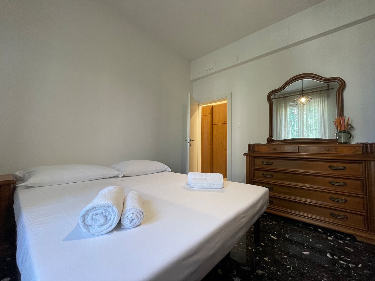 Bellissimo appartamento completamente affrescato e affacciato su ampio giardino. Due camere matrimoniali, ciascuna con bagno. Una camera con letto singolo ed un letto ad una piazza e mezza. Cucina abitabile attrezzata, sala da pranzo, salotto.Piano inferiore home video, ping pong, biliardino, palestra , terzo bagno. L'appuntamento si trova in centro città. Parcheggio pubblico e privato nelle immediate vicinanze. Per soggiorni prolungati tariffe da concordare.