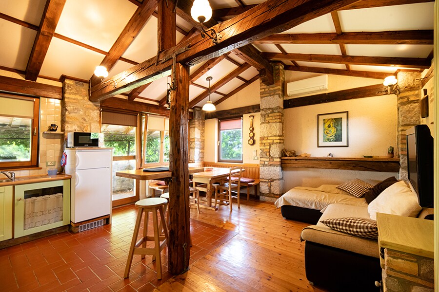 2 yataq otağı və divan-çarpayısı, böyük və avadanlıqlarla təchiz olunmuş mətbəxi, duşu olan hamamı olan bir mərtəbəli müstəqil ev. Həyətin içində 2 avtomobil üçün parkinq var (elektrikli avtomobillər üçün pulsuz enerji doldurma). Paltaryuyan maşın, quruducu, ütü və velosiped parkı olan bir köməkçi bina var. Əmlakın tamamlayıcı hissəsi isə ətirli bitkilərlə dolu bağ, içməli su fontanı, açıq hava masası, çətir və barbeküdür. Avtomobil yolu çıxışına və VE-TS dəmir yolu xəttinə yaxındır