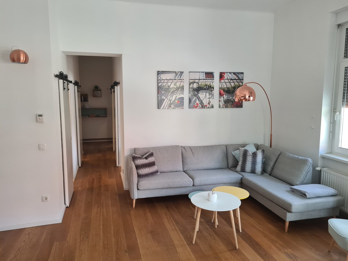 Bu mənzil Maribordakı qonaqlamanızı unudulmaz etmək üçündür. Təmir edərkən binanın ilkin antik quruluşuna sadiq qalmağa çalışırdıq ki, mənzilin sahəsi cəmi üç sahəyə bölünsün. Lakin bütün otaqlar çox böyükdür. Əsasən qonaq otağı, mətbəx və yemək sahəsi bir böyük məkandır. İş üçün səyahət etdiyiniz halda yataq otağına mini ofis sahəsi və vanna otağında vannası olan sauna əlavə etmişik, odur ki, spada qaldığınızı hiss edəcəksiniz.