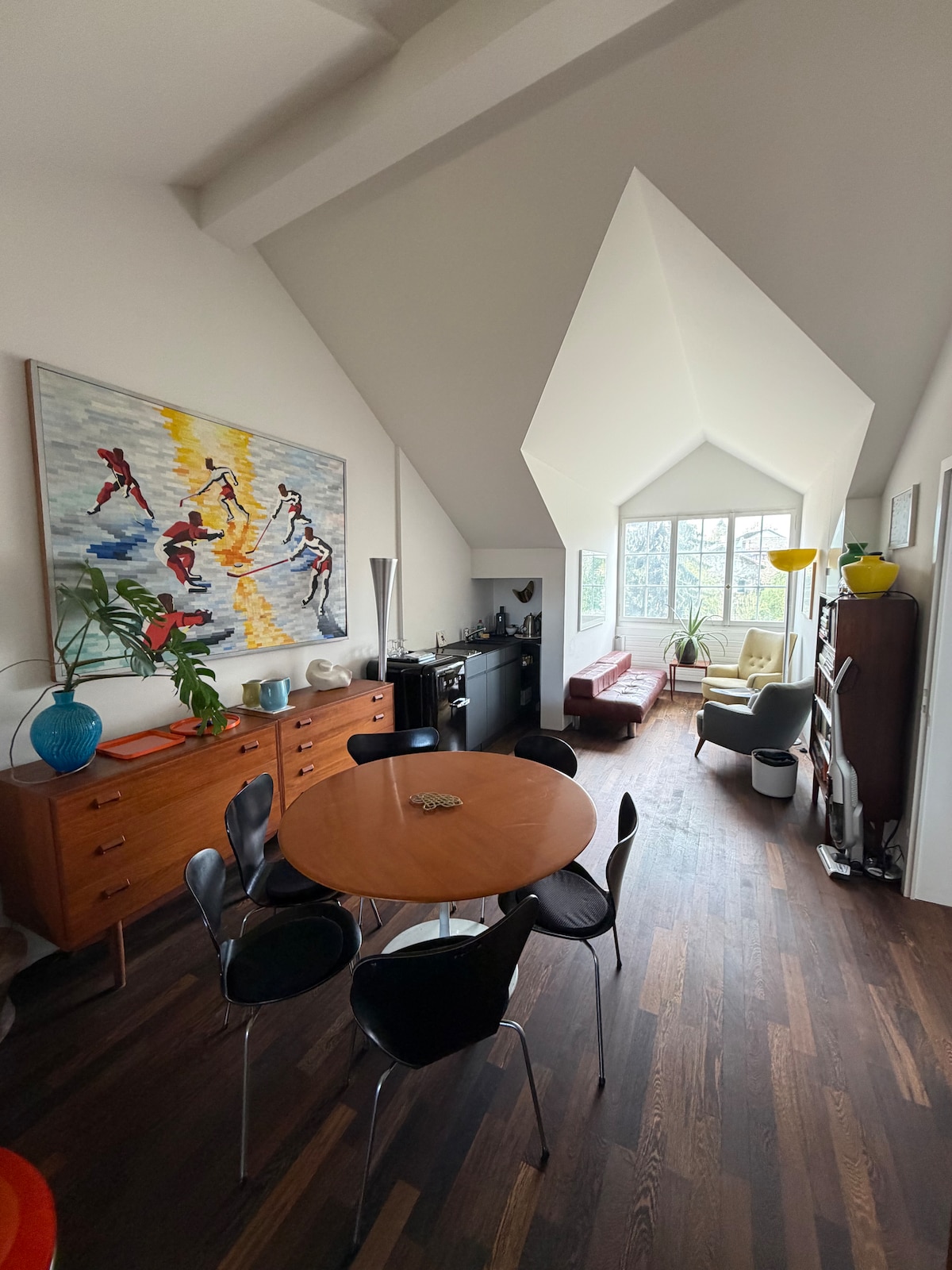 In the heart of Zurich – just 7 minutes to the main train station, 4 minutes to Letzigrund Stadium, and 12 minutes to the airport. The Old Town and ETH are only 10 minutes away. Spacious two-level penthouse loft with modern design and authentic retro industrial charm in a converted factory building. Restaurants, shopping, and a fitness center are located directly in the building. Steps from nightlife, riverfront, galleries, and museums. Public parking nearby (fee applies). Stylish city living!