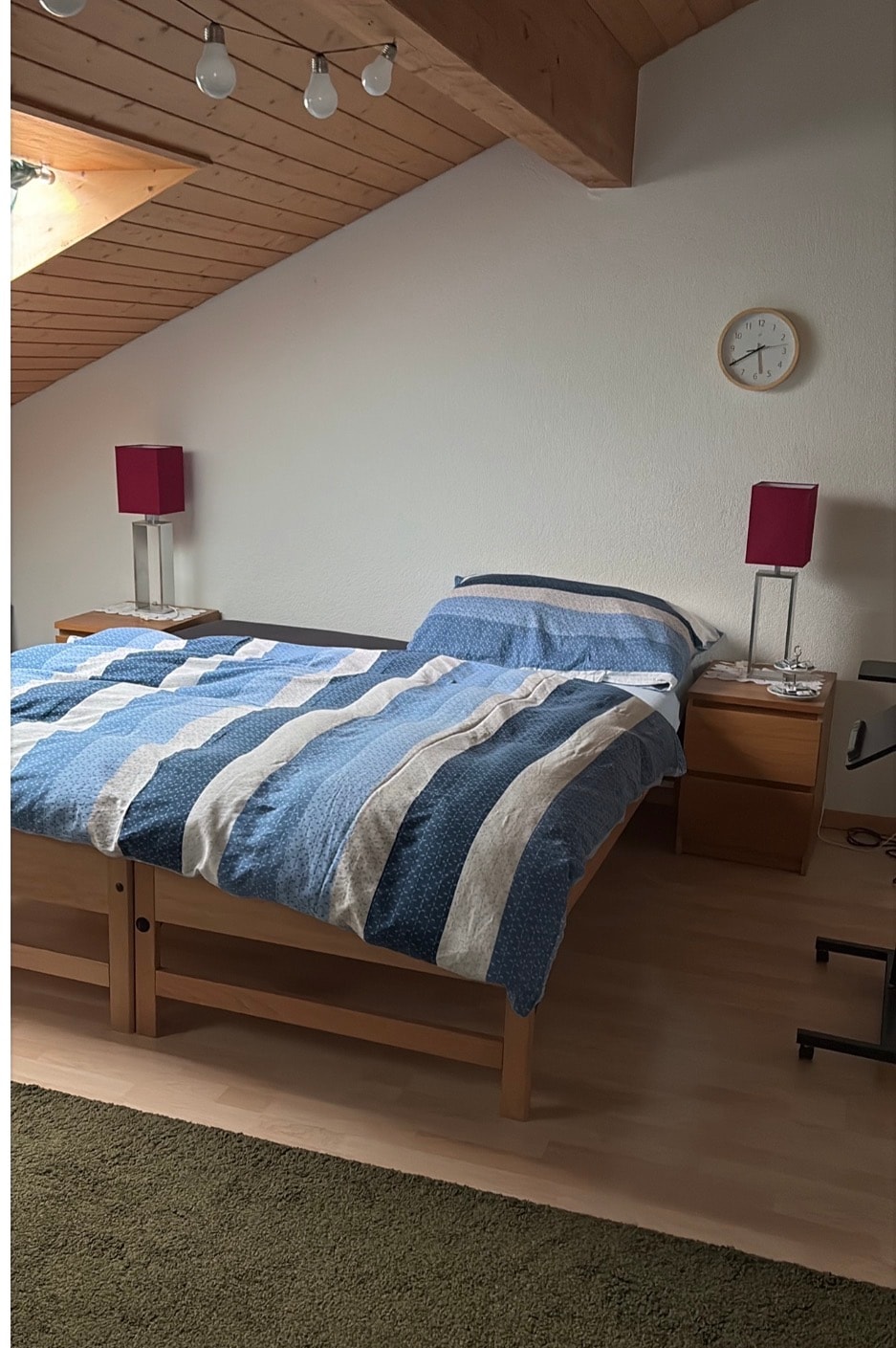 Ailə evinin yuxarı mərtəbəsində 2 otaq var. Ayrıca saxlama yeri olan yatmaq/yaşamaq üçün balkonlu böyük otaq (18 m2). İş/iş üçün kiçik otaq (7 m2). İşgüzar və ya təhsil qonaqlamaları üçün idealdır. Birinci mərtəbədə tualet/duşu olan ayrıca hamam otağı. İçindəki paltaryuyan maşın həftədə bir dəfə mülk sahibi tərəfindən istifadə olunur. Mətbəxdən və böyük günəşli təbii bağdan şərikli istifadə. Sürix şəhərinə və ya gölə qatar və ya avtobusla 15 dəq. Alış-veriş, gözəl yürüyüş sahəsi, meşə 100 m
